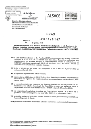 portant notification de la décision d'autorisation budgétaire et fixation de la dotation globalisée 2020 du service d'accompagnement médico-social pour adultes handicapés (SAMSAH) de WINTZENHEIM de l'association "ARSEA" à STRASBOURG Resumé Pièces jointes ARRETE Assemblée : Non défini Date : 15/09/2020 Rapporteur : Non défini Collectivité : Conseil départemental du Haut-Rhin Direction : Non défini Service : Direction Ressources Solidarité Domaine : Dotations financières Commission :