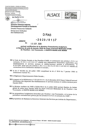 portant notification de la décision d'autorisation budgétaire et fixation du prix de journée 2020 du foyer d'accueil médicalisé (FAM) de l'institut "Les Tournesols" à SAINTE MARIE AUX MINES Resumé Pièces jointes ARRETE Assemblée : Non défini Date : 15/09/2020 Rapporteur : Non défini Collectivité : Conseil départemental du Haut-Rhin Direction : Non défini Service : Direction Ressources Solidarité Domaine : Prix de Journée Commission :