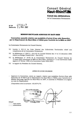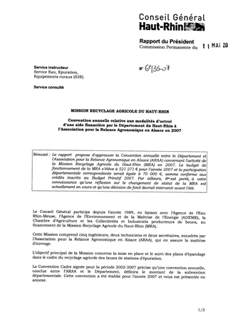 Le rapport propose d'approuver la Convention annuelle entre le Département et l'Association pour la Relance Agronomique en Alsace (ARAA) concernant l'activité de la Mission Recyclage Agricole du Haut-Rhin (MRA) en 2007. Le budget de fonctionnement de la MRA s’élève à 521 271 € pour l’année 2007 et la participation départementale correspondante serait égale à 70 000 €, somme conforme aux crédits inscrits au Budget Primitif 2007. Par ailleurs, il est porté à votre connaissance qu’une réflexion sur le changement de statut de la MRA est actuellement en cours et qu’une décision de fond devrait intervenir avant l’été.