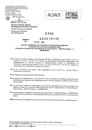 portant notification de la décision d'autorisation budgétaire et fixation de la dotation globalisée 2020 du service d'accueil de jour (SAJ) de l'association "APEI Sud Alsace" à HIRSINGUE Resumé Pièces jointes ARRETE Assemblée : Non défini Date : 15/09/2020 Rapporteur : Non défini Collectivité : Conseil départemental du Haut-Rhin Direction : Non défini Service : Direction Ressources Solidarité Domaine : Dotations financières Commission :