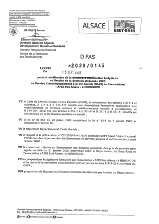 portant notification de la décision d'autorisation budgétaire et fixation de la dotation globalisée 2020 du service d'accompagnement à la vie sociale (SAVS) de l'association "APEI Sud Alsace" à HIRSINGUE Resumé Pièces jointes ARRETE Assemblée : Non défini Date : 15/09/2020 Rapporteur : Non défini Collectivité : Conseil départemental du Haut-Rhin Direction : Non défini Service : Direction Ressources Solidarité Domaine : Dotations financières Commission :