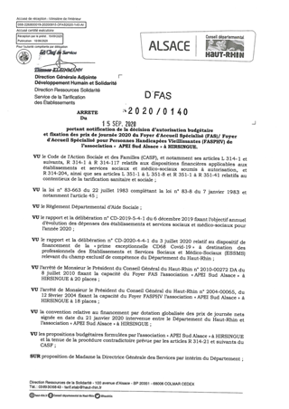 portant notification de la décision d'autorisation budgétaire et fixation des prix de journée 2020 du foyer d'accueil spécialisé (FAS) / Foyer d'accueil spécialisé pour personnes handicapées vieillissantes (FASPHV) de l'assoc. "APEI Sud Alsace" à HIRSINGU