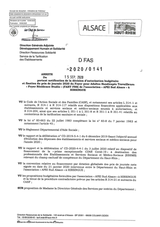 portant notification de la décision d'autorisation budgétaire et fixation des prix de journée 2020 du foyer pour adultes handicapés travailleurs "Foyer Résidence Studio" (FAHT FRS) de l'association "APEI Sud Alsace" à HIRSINGUE Resumé Pièces jointes ARRETE Assemblée : Non défini Date : 15/09/2020 Rapporteur : Non défini Collectivité : Conseil départemental du Haut-Rhin Direction : Non défini Service : Direction Ressources Solidarité Domaine : Prix de Journée Commission :