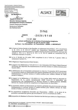 portant notification de la décision d'autorisation budgétaire et fixation du prix de journée 2020 du foyer "Les Hirondelles" de l'association "ARSEA" à BRUNSTATT Resumé Pièces jointes ARRETE Assemblée : Non défini Date : 15/09/2020 Rapporteur : Non défini Collectivité : Conseil départemental du Haut-Rhin Direction : Non défini Service : Direction Ressources Solidarité Domaine : Prix de Journée Commission :