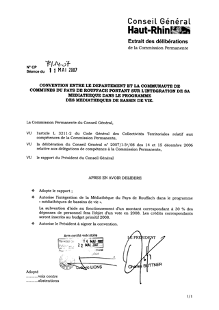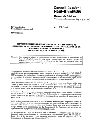 Convention entre le Département et la Communauté de Communes du pays de Rouffach portant sur l'intégration de sa médiathèque dans le programme des médiathèques de bassin de vie