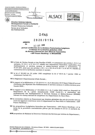 portant notification de la décision d'autorisation budgétaire et fixation de la dotation globalisée 2020 du service d'accueil de jour (SAJ) de l'association "APF France Handicap" à MULHOUSE Resumé Pièces jointes ARRETE Assemblée : Non défini Date : 22/09/2020 Rapporteur : Non défini Collectivité : Conseil départemental du Haut-Rhin Direction : Non défini Service : Direction Ressources Solidarité Domaine : Dotations financières Commission :