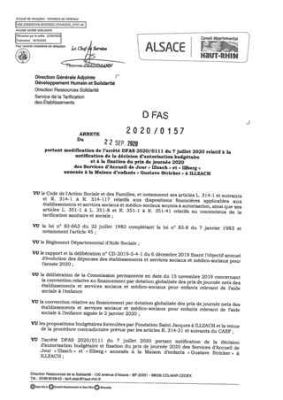 portant modification de l'arrêté DFAS 2020/0111 du 07.07.2020 relatif à la notification de la décision d'autorisation budgétaire et à la fixation du prix de journée 2020 des services d'accueil de jour "Illzach" et "Illberg" annexés à la maison d'enfants