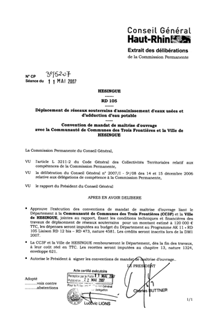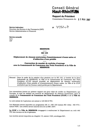 Dans le cadre de la création d'un giratoire sur la RD 105, à l'entrée de la Zone Industrielle de HESINGUE, la Ville et la Communauté de Communes des Trois Frontières (CC3F) doivent procéder au déplacement de réseaux souterrains d’adduction d’eau potable et d'assainissement d'eaux usées. La Ville et la CC3F souhaitent que les travaux soient portés par le Département.