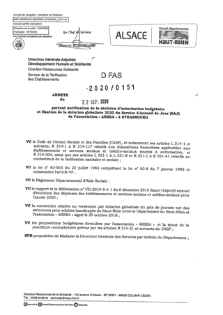 portant notification de la décision d'autorisation budgétaire et fixation de la dotation globalisée 2020 du service d'accueil de jour (SAJ) de l'association "ARSEA" à STRASBOURG Resumé Pièces jointes ARRETE Assemblée : Non défini Date : 22/09/2020 Rapporteur : Non défini Collectivité : Conseil départemental du Haut-Rhin Direction : Non défini Service : Direction Ressources Solidarité Domaine : Dotations financières Commission :