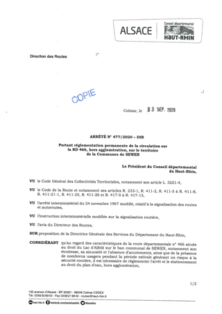 portant réglementation permanente de la circulation sur la RD 466, hors agglomération, sur le territoire de la commune de SEWEN Resumé Pièces jointes ARRETE Assemblée : Non défini Date : 23/09/2020 Rapporteur : Non défini Collectivité : Conseil départemental du Haut-Rhin Direction : Non défini Service : Direction des Routes Domaine : Circulation Commission :