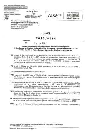 portant notification de la décision d'autorisation budgétaire et fixation de la dotation globalisée 2020 du service d'accompagnement à la vie sociale (SAVS) de l'association "Marguerite Sinclair" à MULHOUSE Resumé Pièces jointes ARRETE Assemblée : Non défini Date : 24/09/2020 Rapporteur : Non défini Collectivité : Conseil départemental du Haut-Rhin Direction : Non défini Service : Direction Ressources Solidarité Domaine : Dotations financières Commission :