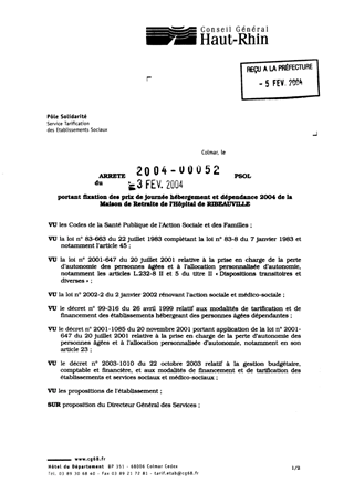 portant fixation des prix de journée hébergement et dépendance 2004 de la maison de retraite de l'hôpital de RIBEAUVILLE. Resumé Pièces jointes ARRETE Assemblée : Non défini Date : 03/02/2004 Rapporteur : Non défini Collectivité : Conseil départemental du Haut-Rhin Direction : Non défini Service : Service de la Tarification des Etablissements Domaine : Prix de Journée Commission :