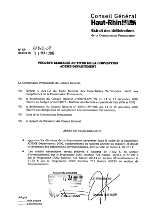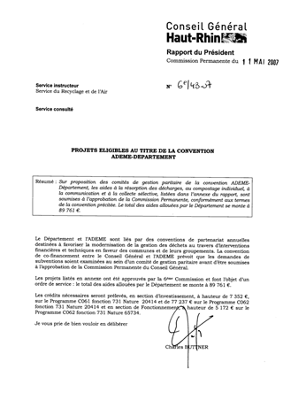 Sur proposition des comités de gestion paritaire de la convention ADEME-Département, les aides à la résorption des décharges, au compostage individuel, à la communication et à la collecte sélective, listées dans l’annexe du rapport, sont soumises à l’approbation de la Commission Permanente, conformément aux termes de la convention précitée. Le total des aides allouées par le Département se monte à 89 761 €.