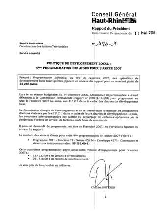 Programmation définitive, au titre de l’exercice 2007, des opérations de développement local telles qu’elles figurent en annexe du rapport pour un montant global de 35 255 euros