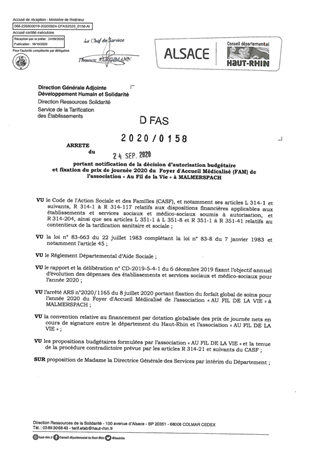 portant notification de la décision d'autorisation budgétaire et fixation du prix de journée 2020 du foyer d'accueil médicalisé (FAM) de l'association "Au fil de la Vie" à MALMERSPACH Resumé Pièces jointes ARRETE Assemblée : Non défini Date : 24/09/2020 Rapporteur : Non défini Collectivité : Conseil départemental du Haut-Rhin Direction : Non défini Service : Direction Ressources Solidarité Domaine : Prix de Journée Commission :