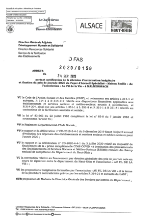 portant notification de la décision d'autorisation budgétaire et fixation du prix de journée 2020 du foyer d'accueil spécialisé "Maison Emilie" de l'association "Au Fil de la Vie" à MALMERSPACH Resumé Pièces jointes ARRETE Assemblée : Non défini Date : 24/09/2020 Rapporteur : Non défini Collectivité : Conseil départemental du Haut-Rhin Direction : Non défini Service : Direction Ressources Solidarité Domaine : Prix de Journée Commission :