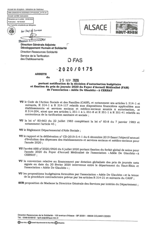 portant notification de la décision d'autorisation budgétaire et fixation du prix de journée 2020 du foyer d'accueil médicalisé (FAM) de l'association "Adèle de Glaubitz" à CERNAY Resumé Pièces jointes ARRETE Assemblée : Non défini Date : 25/09/2020 Rapporteur : Non défini Collectivité : Conseil départemental du Haut-Rhin Direction : Non défini Service : Direction Ressources Solidarité Domaine : Prix de Journée Commission :
