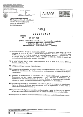 portant notification de la décision d'autorisation budgétaire et fixation de la dotation globalisée 2020 du service d'accueil de jour (SAJ) de l'association "Adèle de Glaubitz" à CERNAY Resumé Pièces jointes ARRETE Assemblée : Non défini Date : 25/09/2020 Rapporteur : Non défini Collectivité : Conseil départemental du Haut-Rhin Direction : Non défini Service : Direction Ressources Solidarité Domaine : Dotations financières Commission :