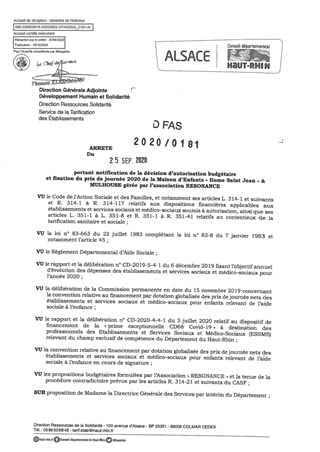 portant notification de la décision d'autorisation budgétaire et fixation du prix de journée 2020 de la maison d'enfants "Home Saint Jean" à MULHOUSE gérée par l'association Résonance Resumé Pièces jointes ARRETE Assemblée : Non défini Date : 25/09/2020 Rapporteur : Non défini Collectivité : Conseil départemental du Haut-Rhin Direction : Non défini Service : Direction Ressources Solidarité Domaine : Prix de Journée Commission :