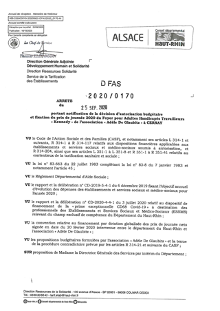 portant notification de la décision d'autorisation budgétaire et fixation du prix de journée 2020 du foyer pour adultes handicapés travailleurs "Kennedy" de l'association "Adèle De Glaubitz" à CERNAY Resumé Pièces jointes ARRETE Assemblée : Non défini Date : 25/09/2020 Rapporteur : Non défini Collectivité : Conseil départemental du Haut-Rhin Direction : Non défini Service : Direction Ressources Solidarité Domaine : Prix de Journée Commission :