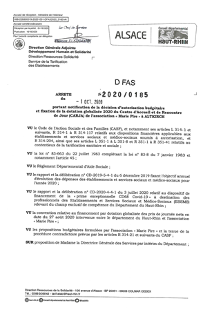 portant notification de la décision d'autorisation budgétaire et fixation de la dotation globalisée 2020 du centre d'accueil et de rencontre de jour (CARJA) de l'association "Marie Pire" à ALTKIRCH Resumé Pièces jointes ARRETE Assemblée : Non défini Date : 01/10/2020 Rapporteur : Non défini Collectivité : Conseil départemental du Haut-Rhin Direction : Non défini Service : Direction Ressources Solidarité Domaine : Dotations financières Commission :