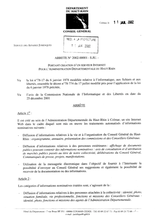 Portant création d'un serveur Internet pour l'Administration Départementale du Haut-Rhin Resumé Pièces jointes ARRETE Assemblée : Non défini Date : 11/01/2002 Rapporteur : Non défini Collectivité : Conseil départemental du Haut-Rhin Direction : Non défini Service : Service Juridique Domaine : Informatique Commission :
