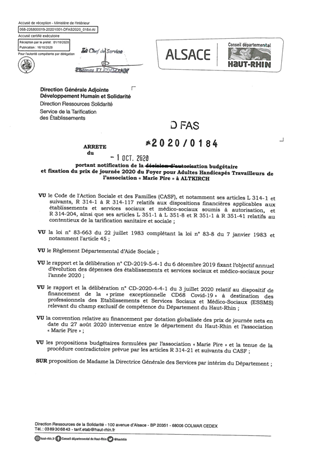 portant notification de la décision d'autorisation budgétaire et fixation du prix de journée 2020 du foyer pour adultes handicapés travailleurs de l'association "Marie Pire" à ALTKIRCH Resumé Pièces jointes ARRETE Assemblée : Non défini Date : 01/10/2020 Rapporteur : Non défini Collectivité : Conseil départemental du Haut-Rhin Direction : Non défini Service : Direction Ressources Solidarité Domaine : Prix de Journée Commission :