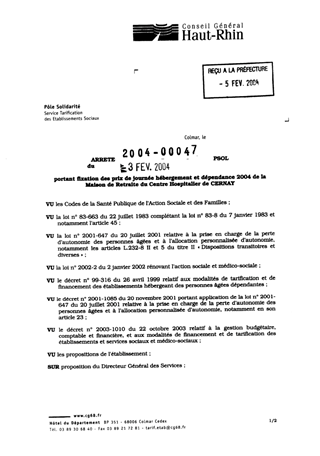 portant fixation des prix de journée hébergement et dépendance 2004 de la maison de retraite du centre hospitalier de CERNAY. Resumé Pièces jointes ARRETE Assemblée : Non défini Date : 03/02/2004 Rapporteur : Non défini Collectivité : Conseil départemental du Haut-Rhin Direction : Non défini Service : Service de la Tarification des Etablissements Domaine : Prix de Journée Commission :