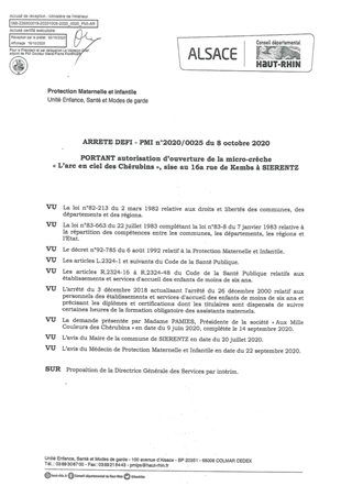 portant autorisation d'ouverture de la micro-crèche "L'arc en ciel des Chérubins", sise au 16a rue de Kembs à SIERENTZ Resumé Pièces jointes ARRETE Assemblée : Non défini Date : 08/10/2020 Rapporteur : Non défini Collectivité : Conseil départemental du Haut-Rhin Direction : Non défini Service : Direction Enfance Famille Insertion Domaine : Accueil d'enfants Commission :