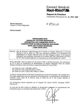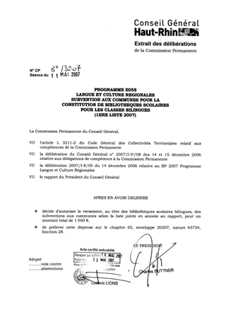 Afin de favoriser l’apprentissage de la lecture en langue allemande, le Conseil Général a mis en place en 1996 une subvention incitative à la constitution de bibliothèques en langue régionale dans les sites bilingues publics. Il est proposé d'attribuer aux communes concernées à la rentrée 2007 des subventions aux taux de 50 % des montants figurant en annexe pour un montant global de 1 050 €.