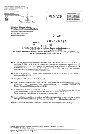 portant notification de la décision d'autorisation budgétaire et fixation de la dotation globalisée 2020 du service d'accompagnement médico-sociale pour adultes handicapés (SAMSAH) de la fondation "Le Phare" à ILLZACH Resumé Pièces jointes ARRETE Assemblée : Non défini Date : 16/10/2020 Rapporteur : Non défini Collectivité : Conseil départemental du Haut-Rhin Direction : Non défini Service : Direction Ressources Solidarité Domaine : Dotations financières Commission :