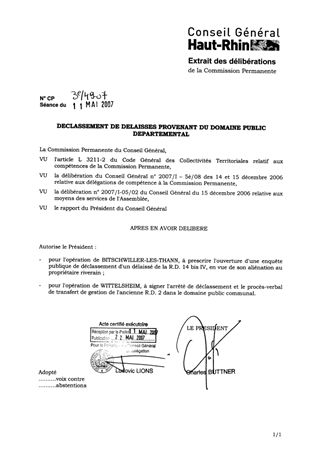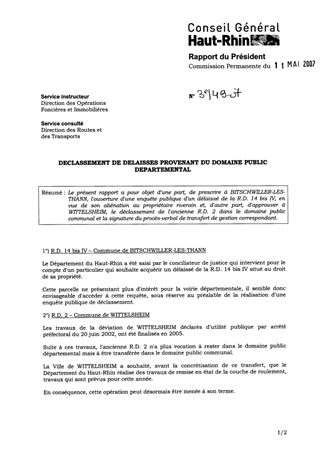 Le présent rapport a pour objet d'une part, de prescrire à BITSCHWILLER-LES-THANN, l'ouverture d'une enquête publique d'un délaissé de la R.D. 14 bis IV, en vue de son aliénation au propriétaire riverain et, d'autre part, d'approuver à WITTELSHEIM, le déclassement de l'ancienne R.D. 2 dans le domaine public communal et la signature du procès-verbal de transfert de gestion correspondant.