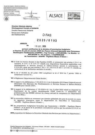 portant notification de la décision d'autorisation budgétaire et fixation des prix de journée 2020 des foyers d'accueil spécialisé pour personnes handicapées vieillissantes (FASPHV) "Cap Conely" à MULHOUSE, "Le Moulin" à MULHOUSE et "St Jacques" à DANNEMA