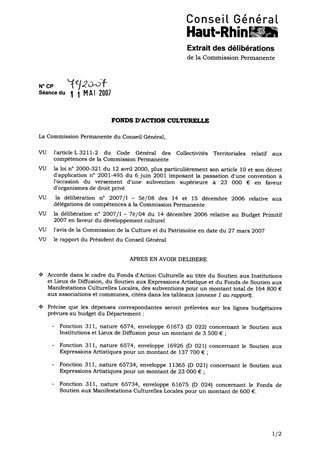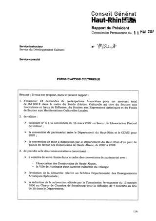 Il vous est proposé, dans le présent rapport : 1. d'examiner 24 demandes de participations financières pour un montant total de 164 800 € dans le cadre du Fonds d'Action Culturelle au titre du Soutien aux Institutions et Lieux de Diffusion, du Soutien aux Expressions Artistiques et du Fonds de Soutien aux Manifestations Culturelles Locales. 2. de valider :  l'avenant n° 5 à la convention du 16 mars 2002 en faveur de l'Association Festival de Colmar ;  la convention de partenariat entre le Département du Haut-Rhin et le CDMC pour 2007 ;  la convention de mise à disposition par le Département du Haut-Rhin d'un parc de pianos en faveur des Dominicains de Haute-Alsace, de 2007 à 2008. 3. de prendre acte des communications concernant :  2 comités de suivi réunis dans le cadre des conventions de partenariat avec :  l'Association des Dominicains de Haute-Alsace,  la Ville de Huningue pour l'activité culturelle du Triangle  l'évolution de la démarche relative au Schéma Départemental des Enseignements Artistiques Spécialisés ;  la réduction de la subvention allouée par la Commission Permanente du 13 octobre 2006 au Chœur de Chambre de Strasbourg pour la diffusion de 4 concerts au lieu de 10 dans le Département