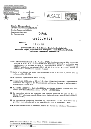 portant notification de la décision d'autorisation budgétaire et fixation du prix de journée 2020 du foyer d'accueil médicalisé (FAM) de l'association "AFAPEI" à BARTENHEIM Resumé Pièces jointes ARRETE Assemblée : Non défini Date : 26/10/2020 Rapporteur : Non défini Collectivité : Conseil départemental du Haut-Rhin Direction : Non défini Service : Direction Ressources Solidarité Domaine : Prix de Journée Commission :