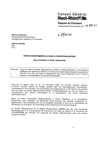 Dans le cadre du Fonds Départemental d’Aide à l’Industrialisation, il est proposé d’affecter aux opérations décrites en annexe un soutien départemental maximum de 481 091 € au titre de l’aide à l’équipement des zones d’activités et de 12 362 € destiné à la réhabilitation des friches industrielles.