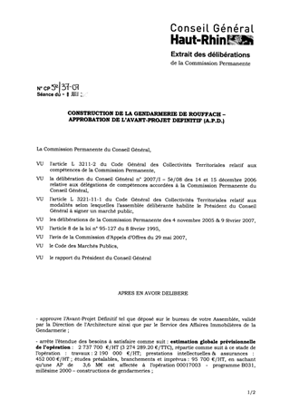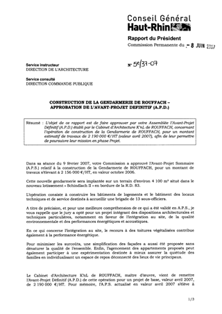 L’objet de ce rapport est de faire approuver par votre Assemblée l’Avant-Projet Définitif (A.P.D.) établi par le Cabinet d’Architecture K’nL de ROUFFACH, concernant l’opération de construction de la Gendarmerie de ROUFFACH, pour un montant estimatif de travaux de 2 190 000 €/HT (valeur avril 2007), afin de leur permettre de poursuivre leur mission en phase Projet.