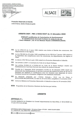 portant modification de l'autorisation de fonctionnement de l'établissement d'accueil d'enfants de moins de six ans "Coeur d'Enfants", sis 10 rue Madame Royale à HUNINGUE (68330) Resumé Pièces jointes ARRETE Assemblée : Non défini Date : 14/12/2020 Rapporteur : Non défini Collectivité : Conseil départemental du Haut-Rhin Direction : Non défini Service : Direction Enfance Famille Insertion Domaine : Accueil d'enfants Commission :