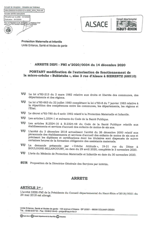 portant modification de l'autorisation de fonctionnement de la micro-crèche "Bubistuba", sise au 3 rue d'Alsace à SIERENTZ (68510) Resumé Pièces jointes ARRETE Assemblée : Non défini Date : 14/12/2020 Rapporteur : Non défini Collectivité : Conseil départemental du Haut-Rhin Direction : Non défini Service : Direction Enfance Famille Insertion Domaine : Accueil d'enfants Commission :