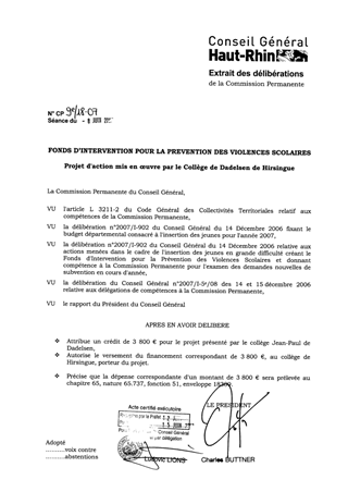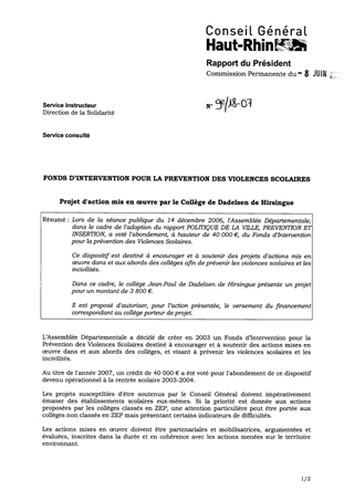 Lors de la séance publique du 14 décembre 2006, l'Assemblée Départementale, dans le cadre de l'adoption du rapport POLITIQUE DE LA VILLE, PREVENTION ET INSERTION, a voté l'abondement, à hauteur de 40 000 €, du Fonds d'Intervention pour la prévention des Violences Scolaires. Ce dispositif est destiné à encourager et à soutenir des projets d'actions mis en œuvre dans et aux abords des collèges afin de prévenir les violences scolaires et les incivilités. Dans ce cadre, le collège Jean-Paul de Dadelsen de Hirsingue présente un projet pour un montant de 3 800 €. Il est proposé d'autoriser, pour l’action présentée, le versement du financement correspondant au collège porteur de projet.
