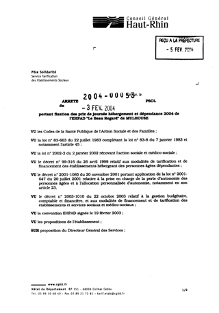 portant fixation des prix de journée hébergement et dépendance 2004 de l'EHPAD "Le Beau Regard" de MULHOUSE. Resumé Pièces jointes ARRETE Assemblée : Non défini Date : 03/02/2004 Rapporteur : Non défini Collectivité : Conseil départemental du Haut-Rhin Direction : Non défini Service : Service de la Tarification des Etablissements Domaine : Prix de Journée Commission :