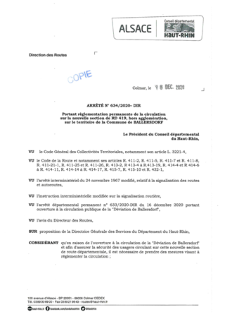 portant règlementation permanente de la circulation sur la nouvelle section de RD 419, hors agglomération, sur le territoire de la commune de BALLERSDORF Resumé Pièces jointes ARRETE Assemblée : Non défini Date : 16/12/2020 Rapporteur : Non défini Collectivité : Conseil départemental du Haut-Rhin Direction : Non défini Service : Direction des Routes Domaine : Circulation Commission :