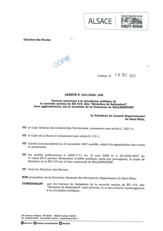 portant ouverture à la circulation publique de la nouvelle section de RD 419, dite "Déviation de Ballersdorf", hors agglomération, sur le territoire de la commune de BALLERSDORF Resumé Pièces jointes ARRETE Assemblée : Non défini Date : 16/12/2020 Rapporteur : Non défini Collectivité : Conseil départemental du Haut-Rhin Direction : Non défini Service : Direction des Routes Domaine : Circulation Commission :
