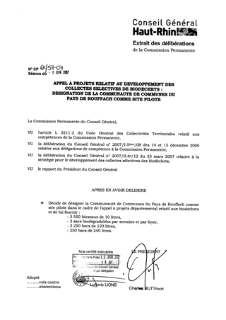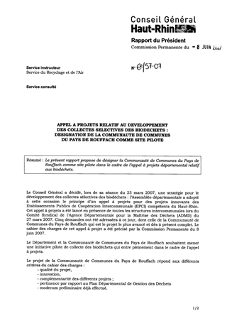Le présent rapport propose de désigner la Communauté de Communes du Pays de Rouffach comme site pilote dans le cadre de l’appel à projets départemental relatif aux biodéchets.