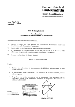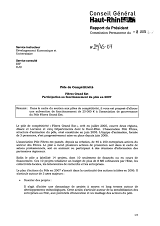 Pôle de compétitivité. Fibres Grand Est. Participation au fonctionnement du pôle en 2007