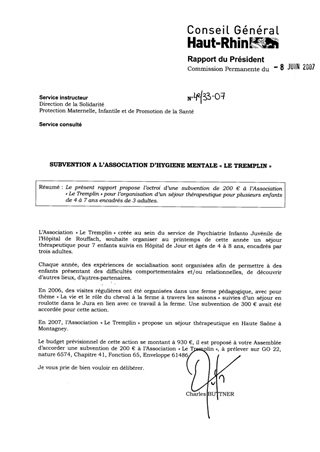 Le présent rapport propose l’octroi d’une subvention de 200 € à l’Association « Le Tremplin » pour l’organisation d’un séjour thérapeutique pour plusieurs enfants de 4 à 7 ans encadrés de 3 adultes.