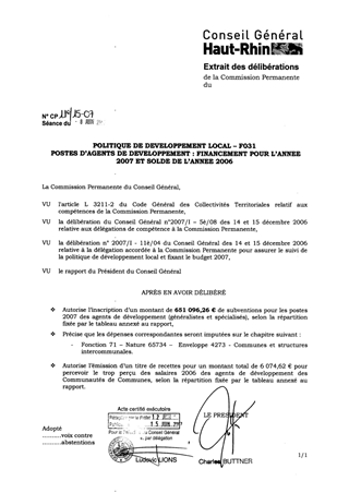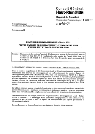 Politique de développement local. F 031. Postes d'agents de développement : financement pour l'année 2007 et solde de l'année 2006