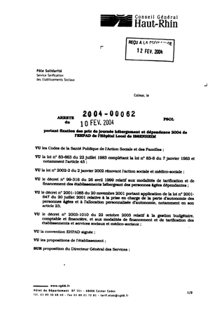 portant fixation des prix de journée hébergement et dépendance 2004 de l'EHPAD de l'hôpital local de ISSENHEIM. Resumé Pièces jointes ARRETE Assemblée : Non défini Date : 10/02/2004 Rapporteur : Non défini Collectivité : Conseil départemental du Haut-Rhin Direction : Non défini Service : Service de la Tarification des Etablissements Domaine : Prix de Journée Commission :