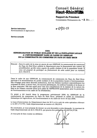 Dans le cadre de la mise en œuvre de son GERPLAN, la communauté de communes du Pays du Ried Brun sollicite le Département pour le financement des actions de sensibilisation qu’elle mène auprès du public scolaire et de la population locale. Il vous est proposé de participer au financement de cette action pour un montant de 6.198,59 €.