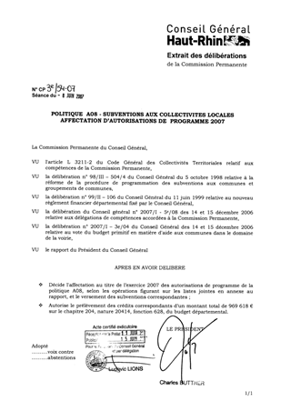 Politique A 08. Subventions aux collectivités locales. Affectation d'autorisations de programme 2007